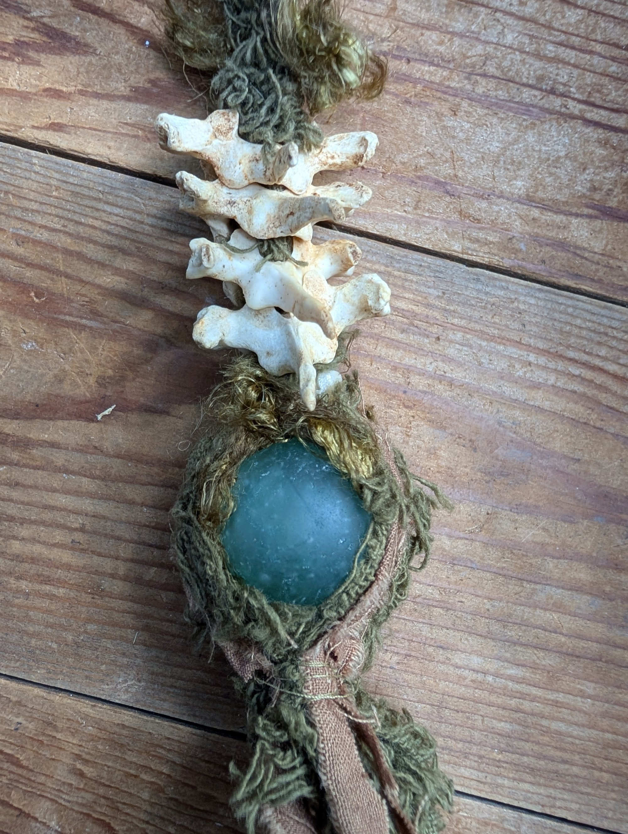 Centerpiece of Beaver vertebrae & recycled glass orb is approx. 6" inches long