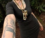 Centerpiece is an Elk antler tip, Opossum hip bone & lichen + deer teeth in a glass vial